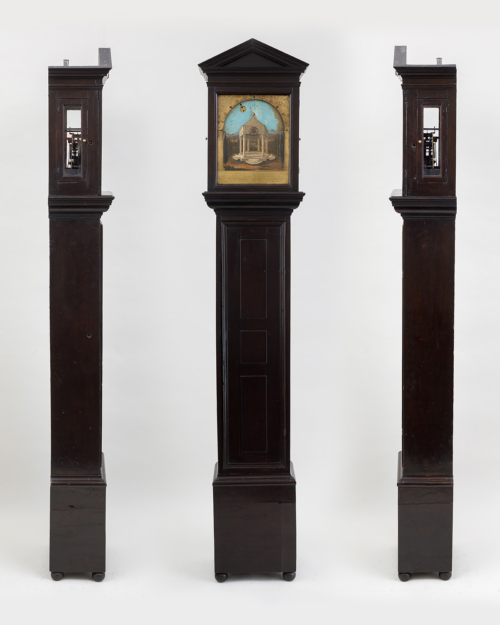 An oil lamp behind the clock face would illuminate the time for reading the clock in the dark. Not many have survived because of the unfriendly feelings between open flames and wooden casing.