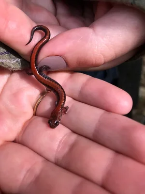I love finding salamanders hiding in rotten logs. Red backed salamanders are common here. They look like this (not my photo):